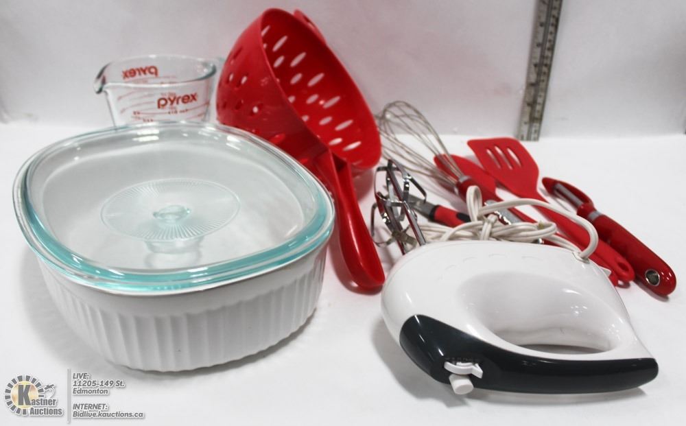 CASSEROLE, AND HAND MIXER. HOUSEHOLD
