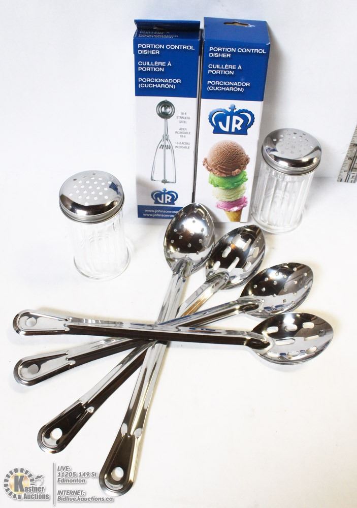 NEW - 2 CHEESE SHAKERS, 2 SLOTTED & 2 PEFORATED 15" STAINLESS SPOONS, 2 PORTION SCOOPS