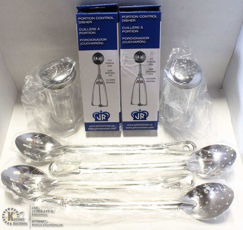 NEW - 2 CHEESE SHAKERS, 2 SLOTTED & 2 PEFORATED 15" STAINLESS SPOONS, 2 PORTION SCOOPS
