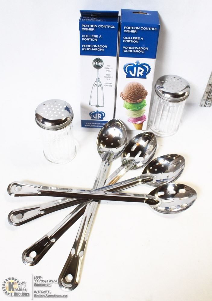 NEW - 2 CHEESE SHAKERS, 2 SLOTTED & 2 PEFORATED 15" STAINLESS SPOONS, 2 PORTION SCOOPS