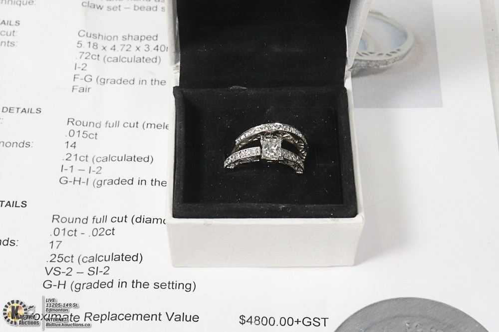 WEIGHT: 2.9G (MAIN RING), 2.0G (BAND), METAL CONTENT: 14K WHITE GOLD, CONDITION: VERY GOOD, MANUFACTURING METHOD: CAST AND HAND ASSEMBLED, SETTING TECHNIQUE: CLAW SET - BEAD SET DIAMOND DETAILS SHAPE AND CUT: CUSHION SHAPEDMEASUREMENTS: 5.18 X 4.72 X 3.40MM WEIGHT: 72CT (CALCULATED), CLARITY: 1-2, COLOR: F-G (GRADED IN THE SETTING), COMES WITH LOCAL APPRAISAL, APPROXIMATE REPLACEMENT VALUE $4,800.00 + GST. JEWELLERY
