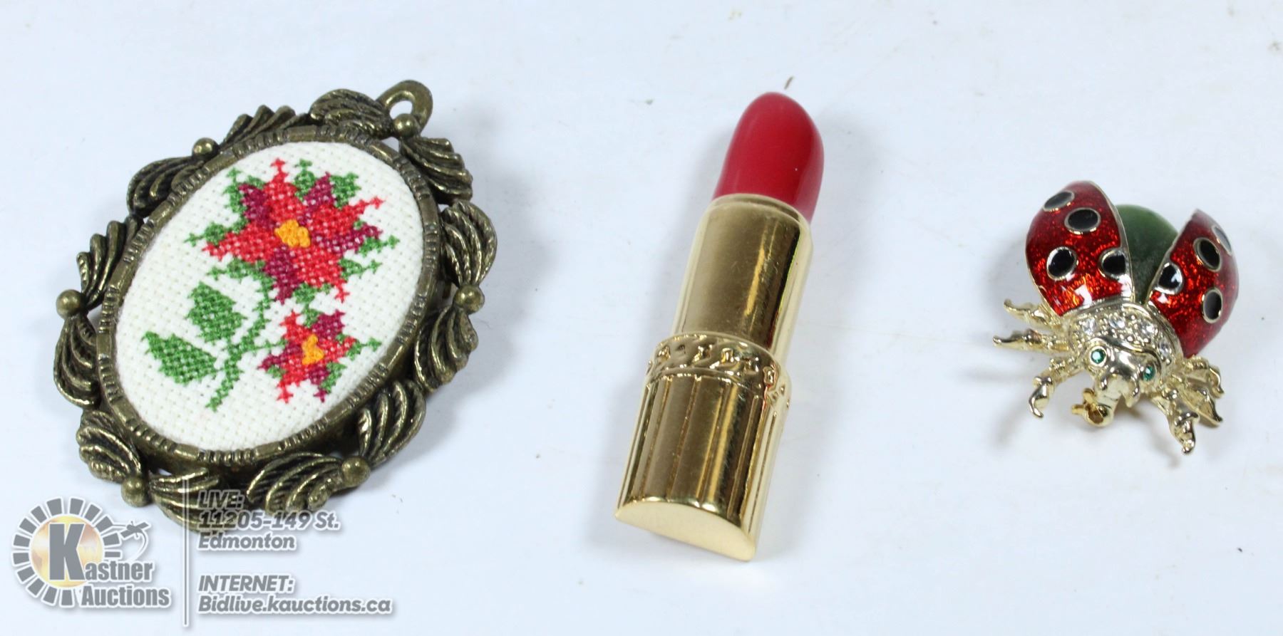 LADY BUG, LIPSTICK, & NEEDPOINT BROOCHES VINTAGE