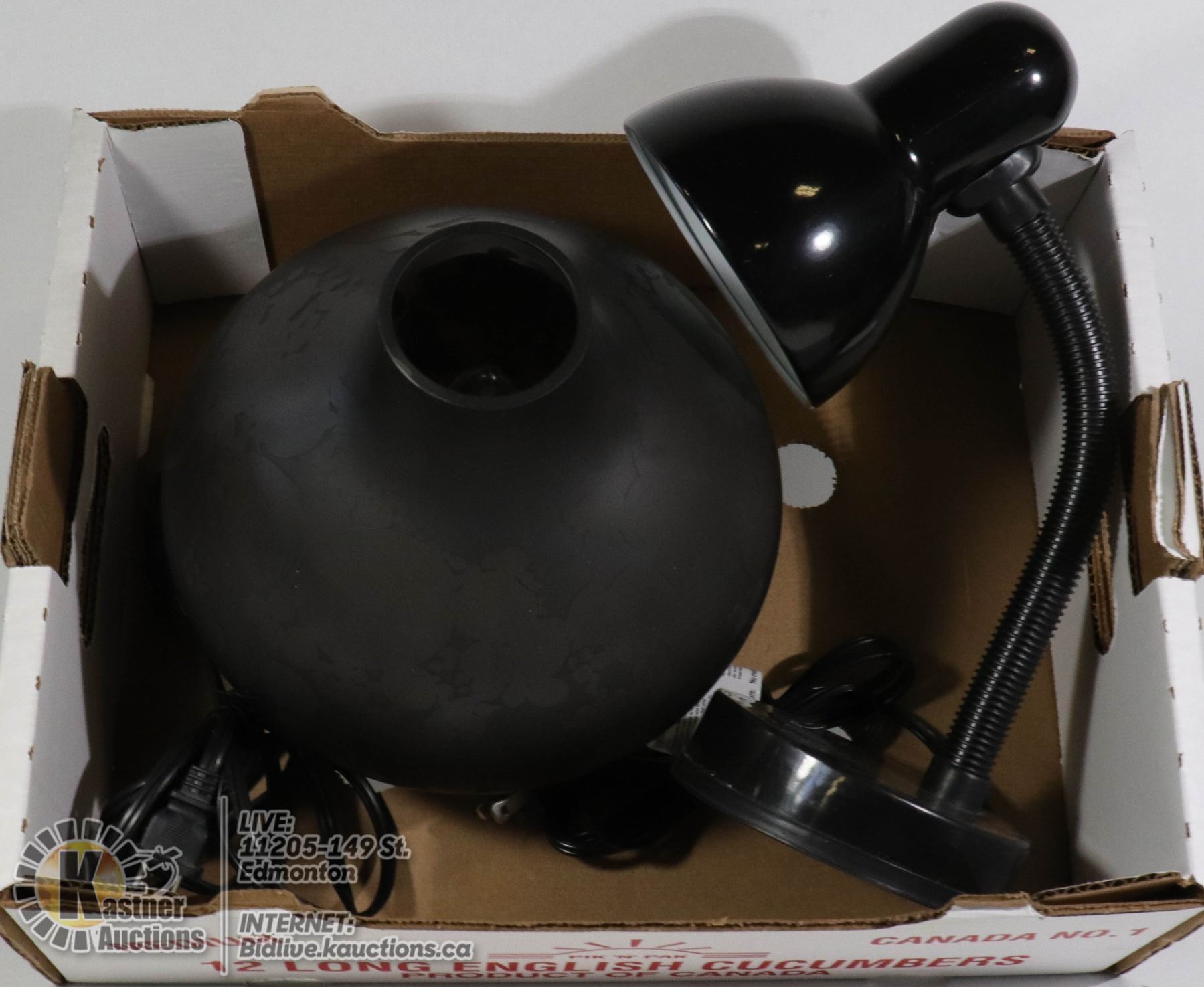 (1) GLASS LAMP, BLACK: 28" CIRCUMFERENCE POWER SWITCH IN CORD; CORD IS APPROX. 70" LONG PATTERN IN GLASS; CREATES A COZY MOOD LIGHT 'FLOATING BUBBLES' PATTERN EMERGES WHEN LIGHT IS TURNED ON. NEVER USED (2) DESK LAMP, BLACK: BRAND NEW