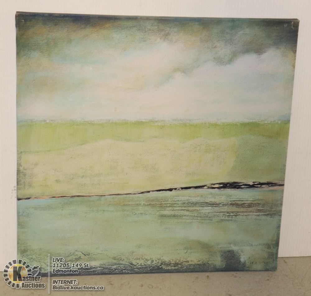SHADES OF BLUE, GREY, GREEN. ABSTRACT LANDSCAPE PRINT ON STRETCHED CANVAS. 20" X 20"