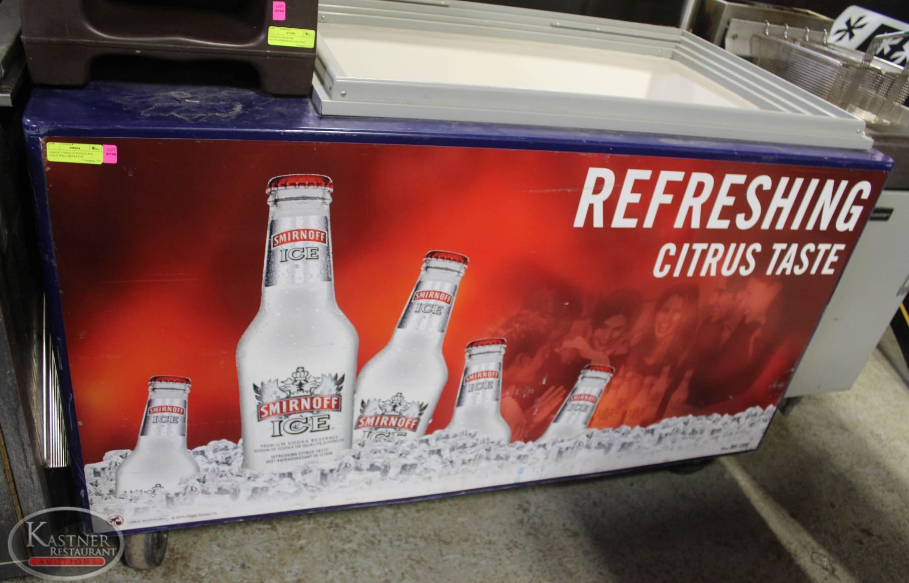 CABINET. (NO COVERS, REACH IN ACCESS) AS IS. NO COOLING COMPRESSOR, ICE BIN FOR SERVING BOTTLED BEVERAGES. HAS SINK DRAIN AND HOSES. 60" X 32" X 36"