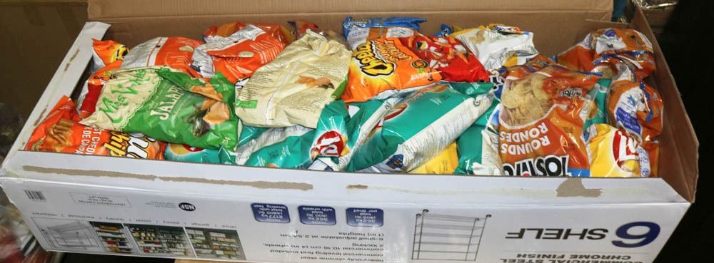LARGE 6 SHELF BOX OF ASSORTED CHIPS ON CHOICE