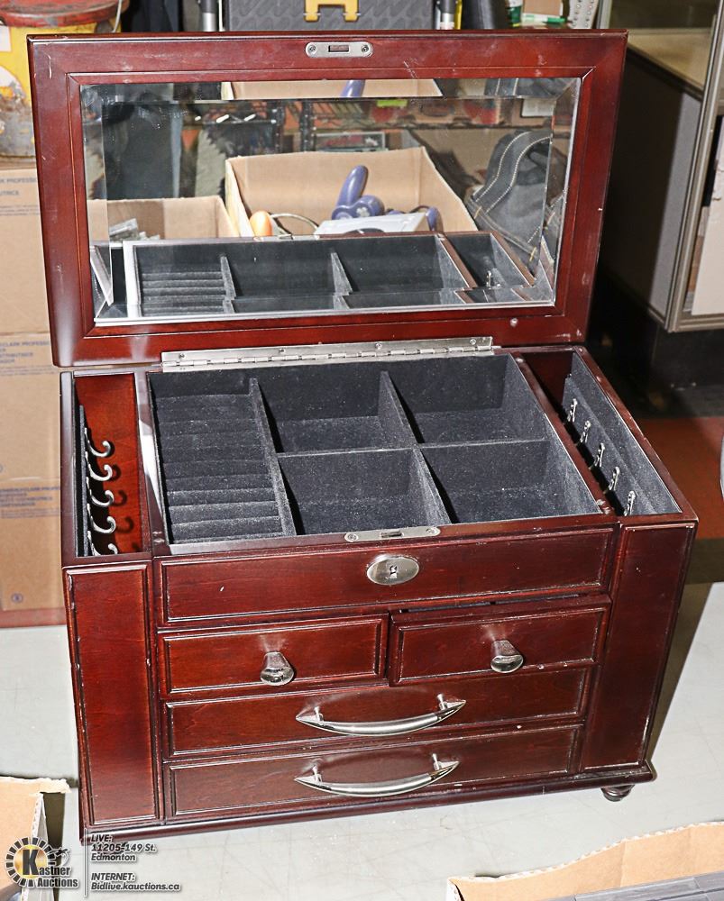 SIDE DRAWERS SWING OUT. TOP DRAWER HAS A BUILT IN MIRROR. COLLECTIBLES