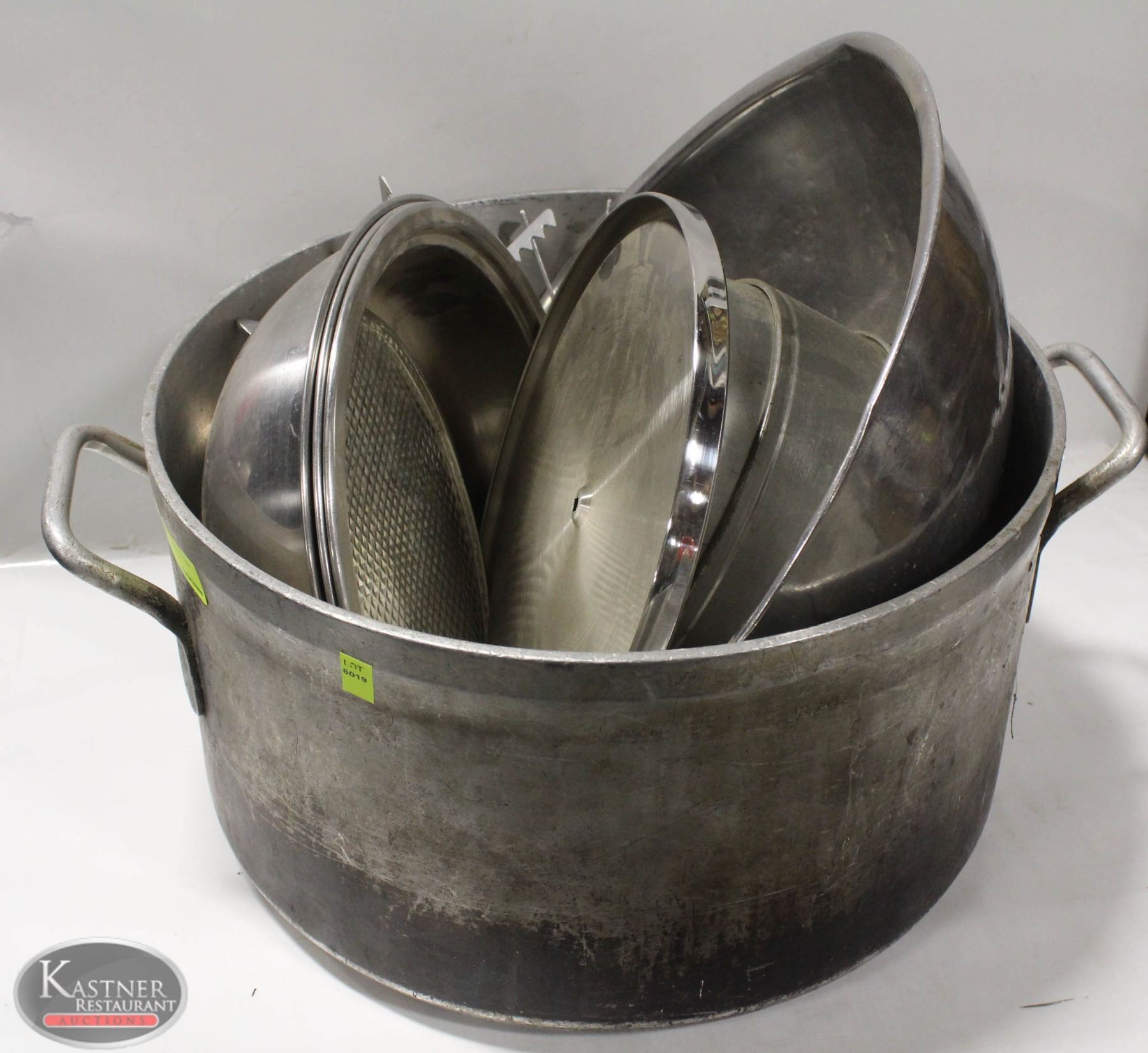 LARGE ALUMINUM STOCK POT W/ LARGE MIXING BOWL,
