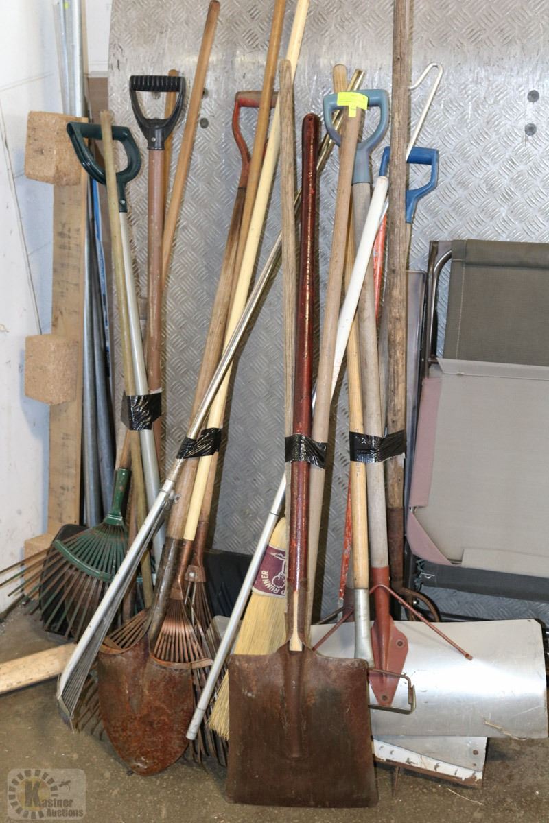LARGE ASSORTMENT OF GARDEN TOOLS, BROOMS, ETC.