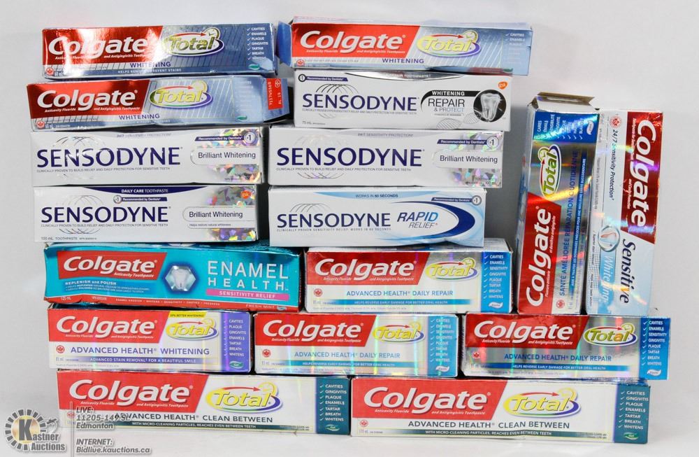 LARGE BAG OF ASSORTED COLGATE TOOTHPASTES.