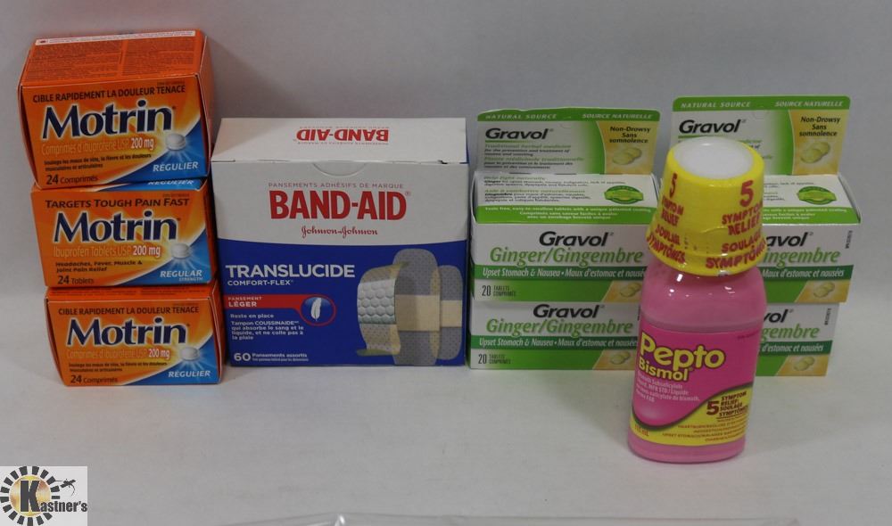 MEDICINE. MOTRIN, GRAVOL, PEPTO BISMOL & BAND AIDS.