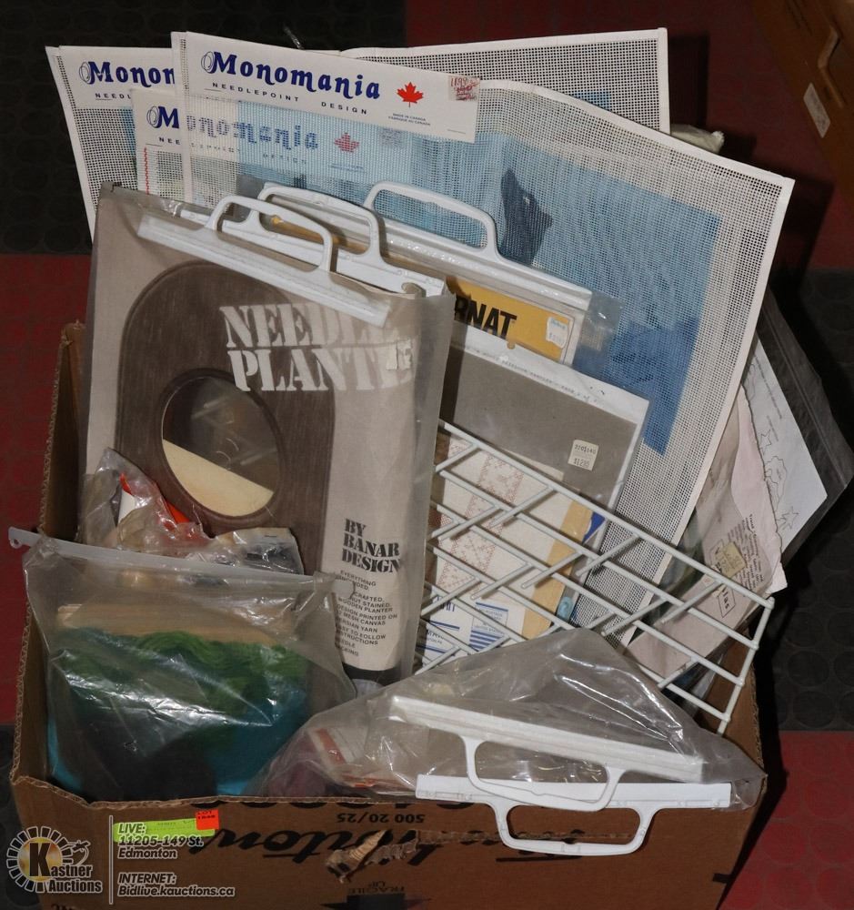 SUPPLIES AND PATTERNS - 2 YARN/THREAD RACKS, OVER A DOZEN NEW PATTERNS, YARN, INSTRUCTIONS, ETC. - GENERAL, HOUSEHOLD
