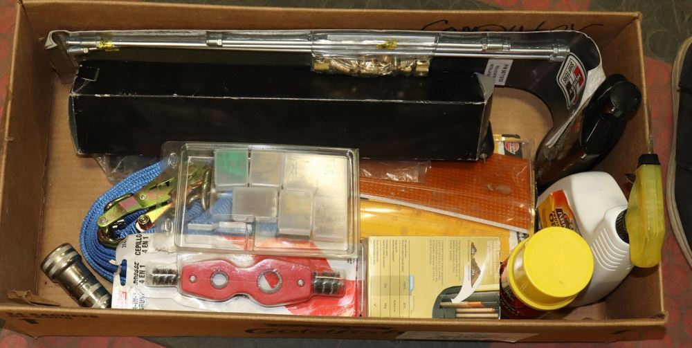 ACCESSORIES AND TOOLS - CAN OF "GREAT STUFF" FOAM CRACK & GAP SEALER, ARMOR ALL, CHEV TAILGAGE ASSIST, NEW FORD LEVEL SENSOR, OIL FILTER, HURST ROLL CONTROL SHIFTER LINKAGE, TIE-DOWN STRAP, LENS/LIGHT REPAIR KIT, ETC.