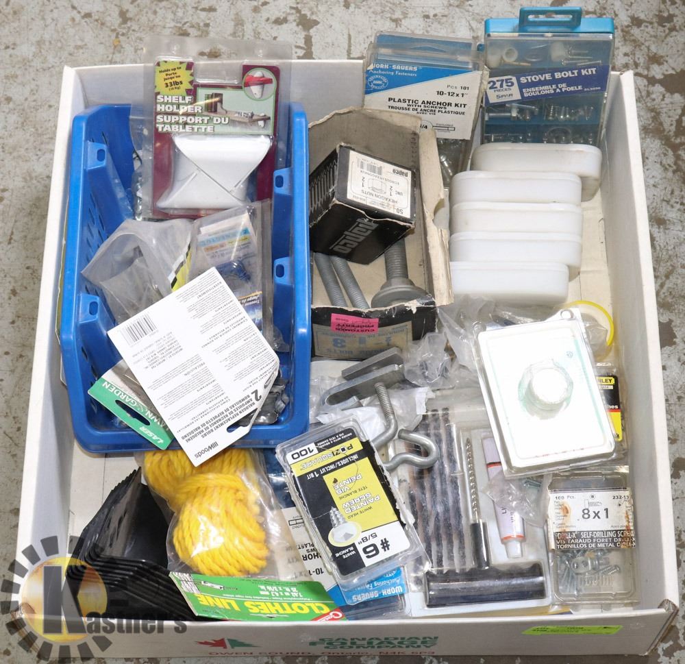 TOOLS - NEW NADAR DIMMING SWITCH, RADIAL TIRE REPAIR KIT, LG. GALVANIZED BOLT & NUT SETS, TRAILER WIRING CLIPS, HARDWARE SORTERS FULL OF NUTS, BOLTS, SCREWS, ETC. - TOOLS