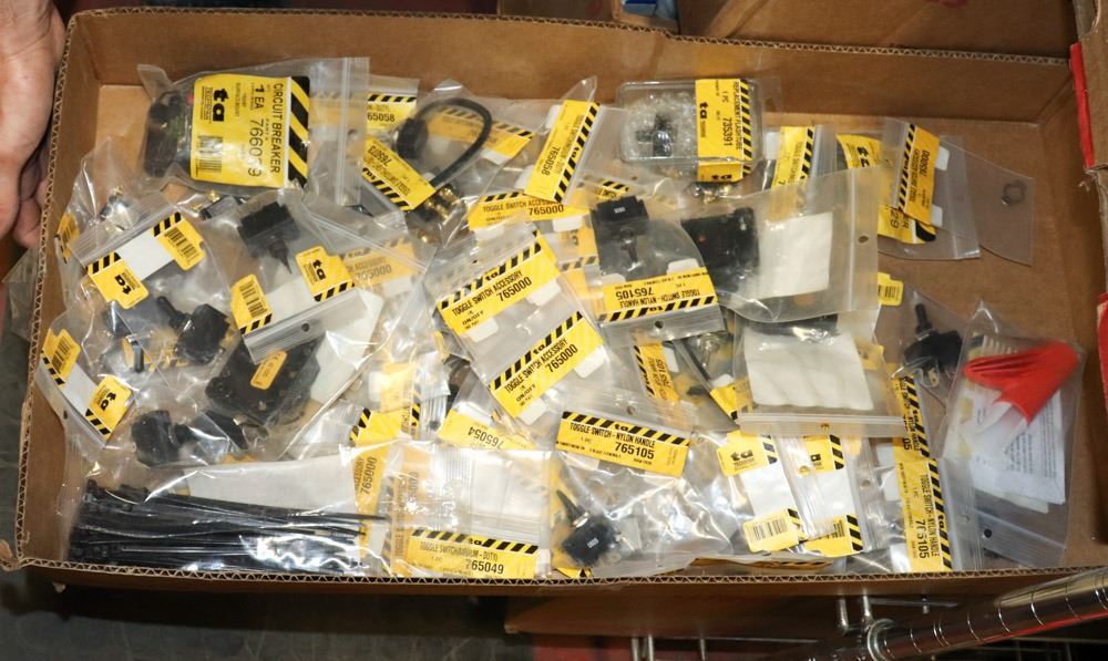 LARGE BOX OF ASSORTED AUTOMOTIVE TOGGLE SWITCHES.
