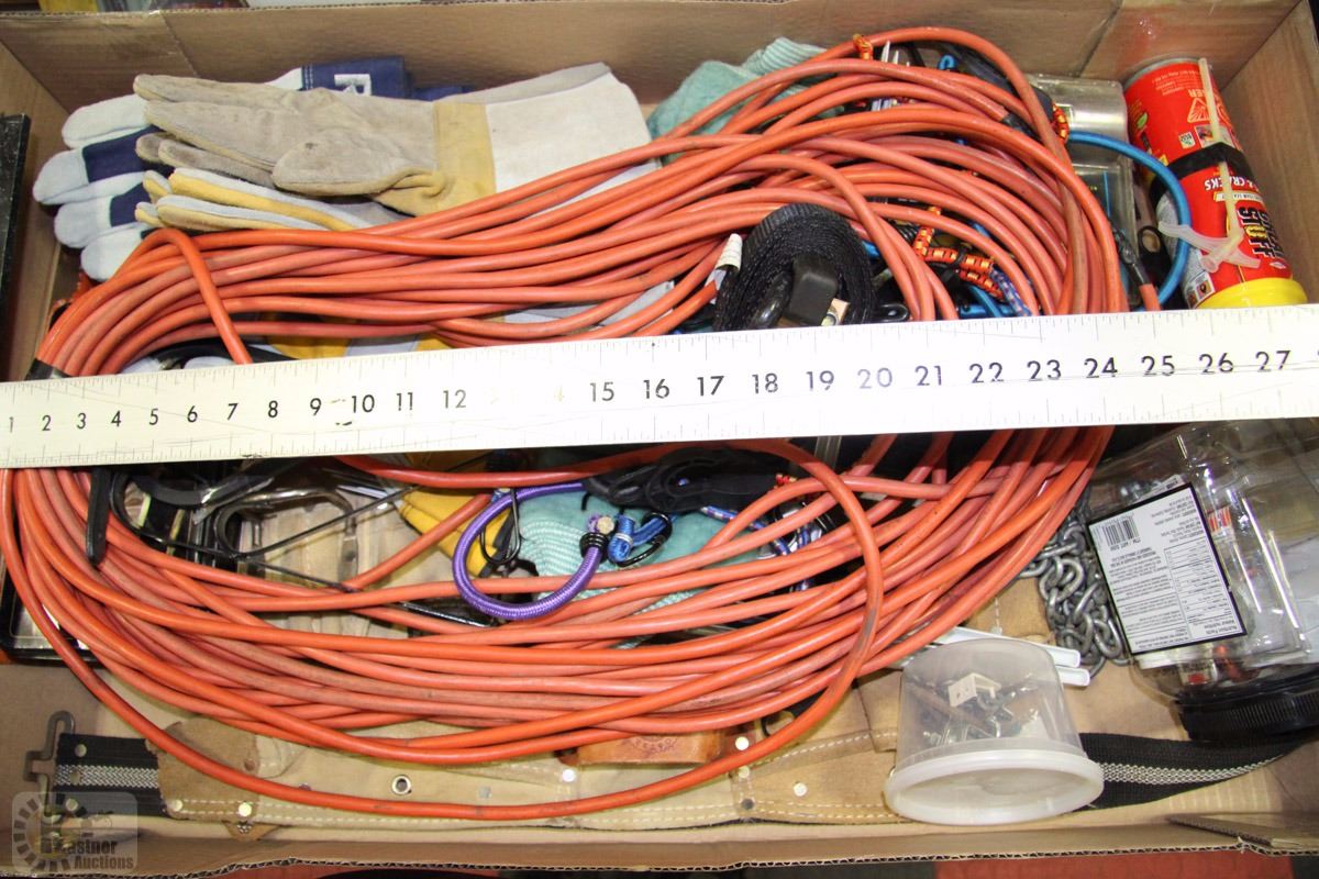 HARDWARE INCLUDING SEVEN PAIRS OF WELDING GLOVES, CARPENTER SAWS, TOOL BELT, TIE DOWNS, & MUCH MORE