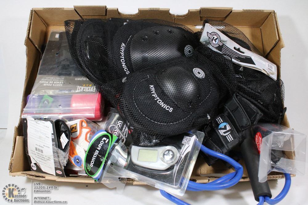 LARGE BOX OF ASSORTED WORKOUT EQUIPMENT