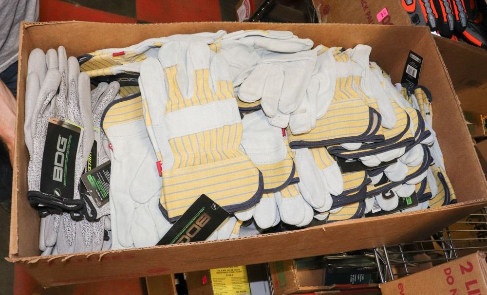 LARGE BOX OF BDG ASSORTED WORK GLOVES.