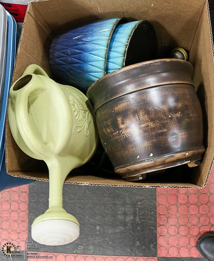 2 GARDEN HOSES, 1 SPRAYER, SET OF TWO BLUE FLOWER POTS AND LARGE BRONZE COLORED FLOWER POT, LARGE WATERING CAN
