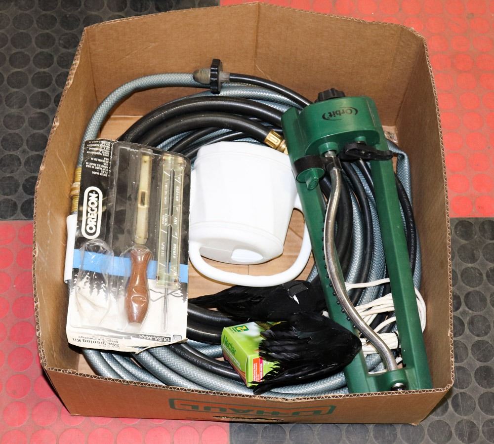 DECORATION INCL. HOSES, SPRINKLER, CHAINSAW SHARPENING KIT, CROW, ETC. - GENERAL, GARDENING