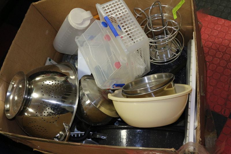 LARGE BOX OF HOUSEHOLD ITEMS CANNERS ETC