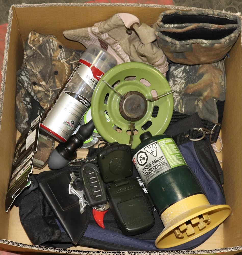 BURNER PROPANE STOVE W/NEW BOTTLE, HUNTER'S SPECIALTIES ELECTRONIC PREDATOR CALL W/REMOTE, SKINNING/BUTTING KNIFE IN SHEATH, WATERPROOF THINSULATE CAMO HUNTING GLOVES, NEW ROLLS OF CAMO TAPE AND WRAP, 3 CAMO HATS, CANVAS RIFFLE CASE -GENERAL, HUNTIN