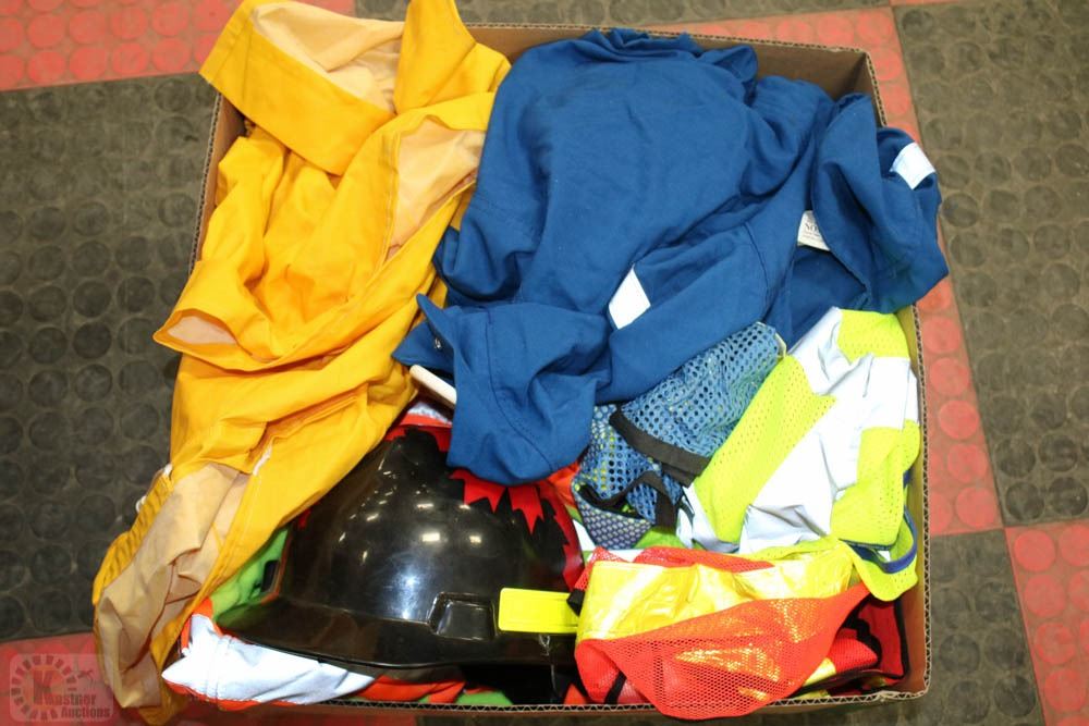 WEAR INCLUDING NOMEX XL MECHANIC STYLE COVERALLS, LARGE RAINCOAT W/HOOD, BLACK & RED MAPLE LEAF HARD HAT, MULTIPLE HI-VIS VESTS