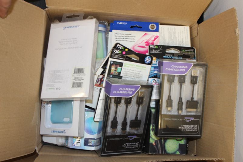 LARGE BOX OF USB CHARGERS, INK CARTRIDGES & MORE!