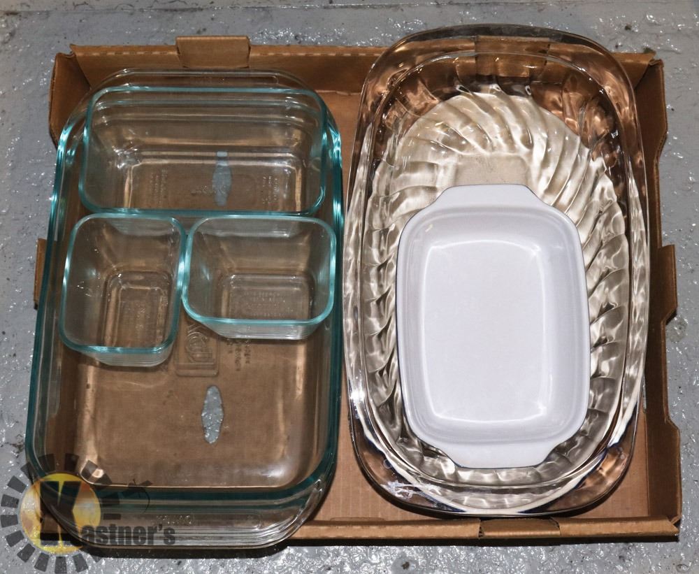 STONEWARE CASSEROLES AND GLASS (VARIOUS SIZES ) SOME ARE PYREX