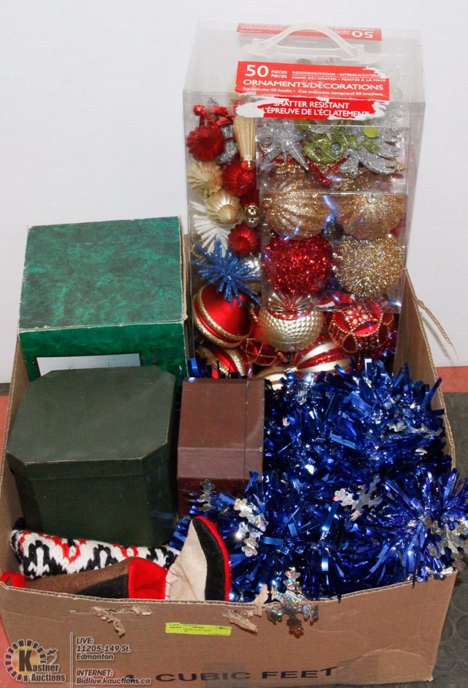 NATIVITY SET, 50-PC SHATTER RESISTANT ORNAMENT SET, BLUE & SILVER GARLAND, STOCKINGS, DECORATIVE GIFT BOXES, ETC. - SEASONAL
