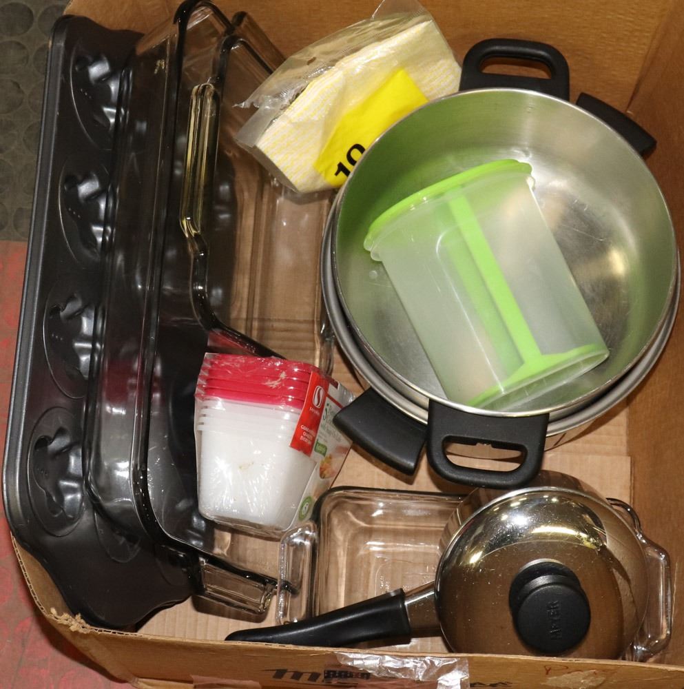 BAKEWARE (5"X9", 8"X8", AND AN 11"X15"), BAKE PAN, 3 POTS, NEW REUSABLE CONTAINERS, ETC. - GENERAL, KITCHENWARE