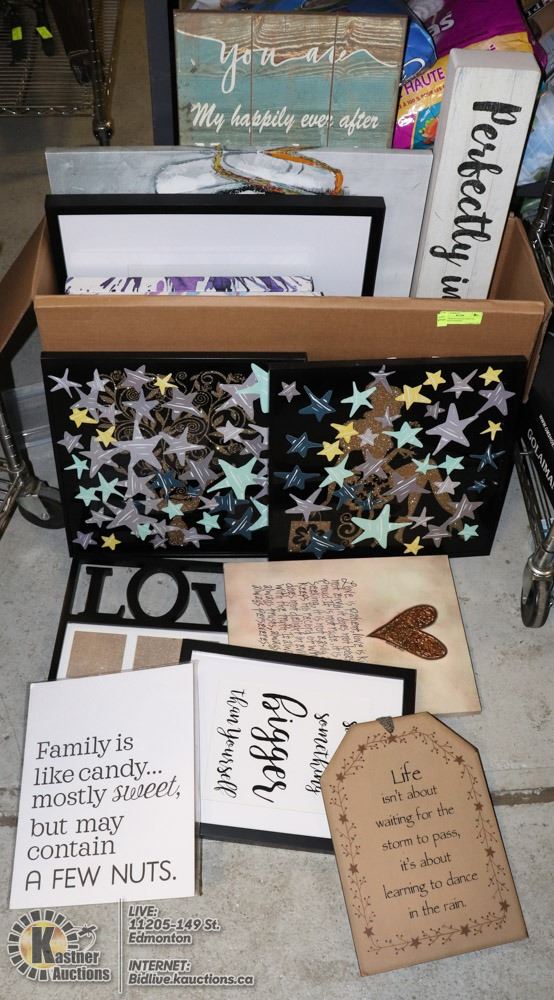 LARGE BOX W/COLLECTION OF PICTURES, PLAQUES,