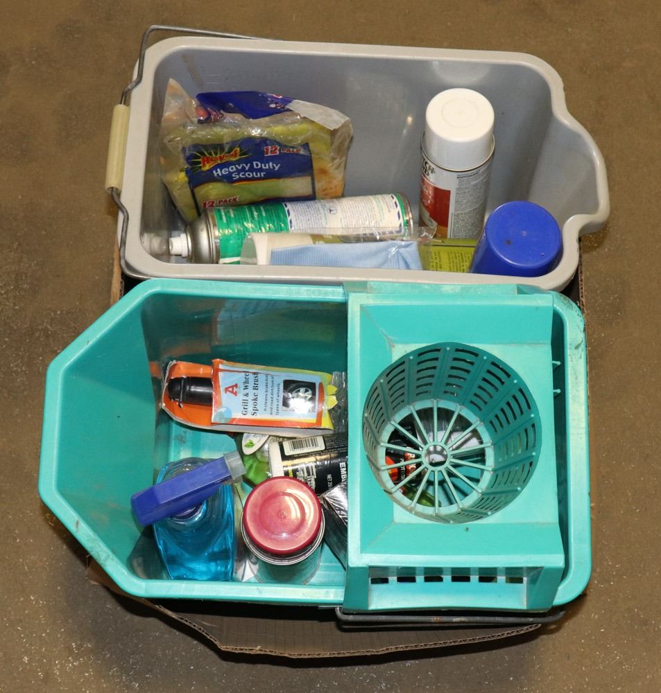 TWO BUCKETS, MURPHY OIL SOAP, GLASS CLEANERS, SCOTCH GUARD FABRIC PROTECTOR, AMOUR-ALL, CLOTHS, SCRUBBERS, BRUSHES, ETC. - GENERAL, HOUSEHOLD/AUTO