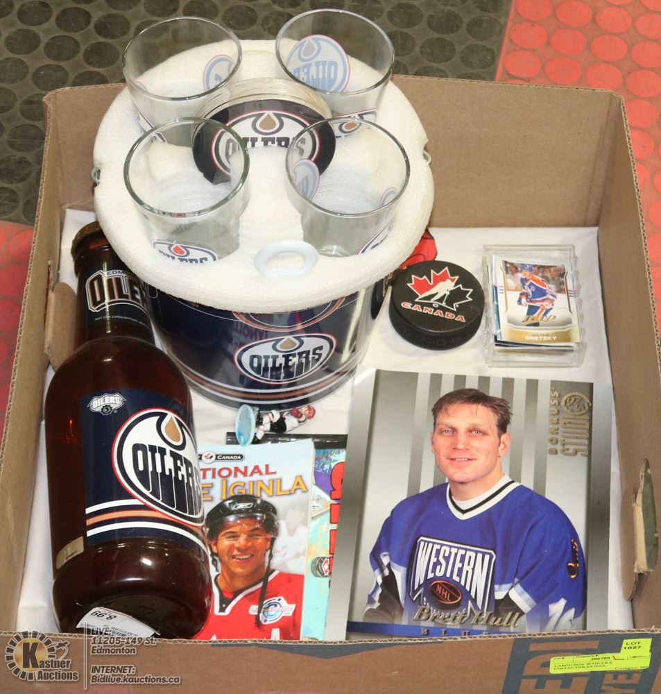 BUCKET W/4 BEER GLASS SET, BOTTLE OPENER, COASTER SET, BOTTLE PIGGY BANK, HOCKEY CARDS, PICTURES, ETC. - COLLECTIBLE