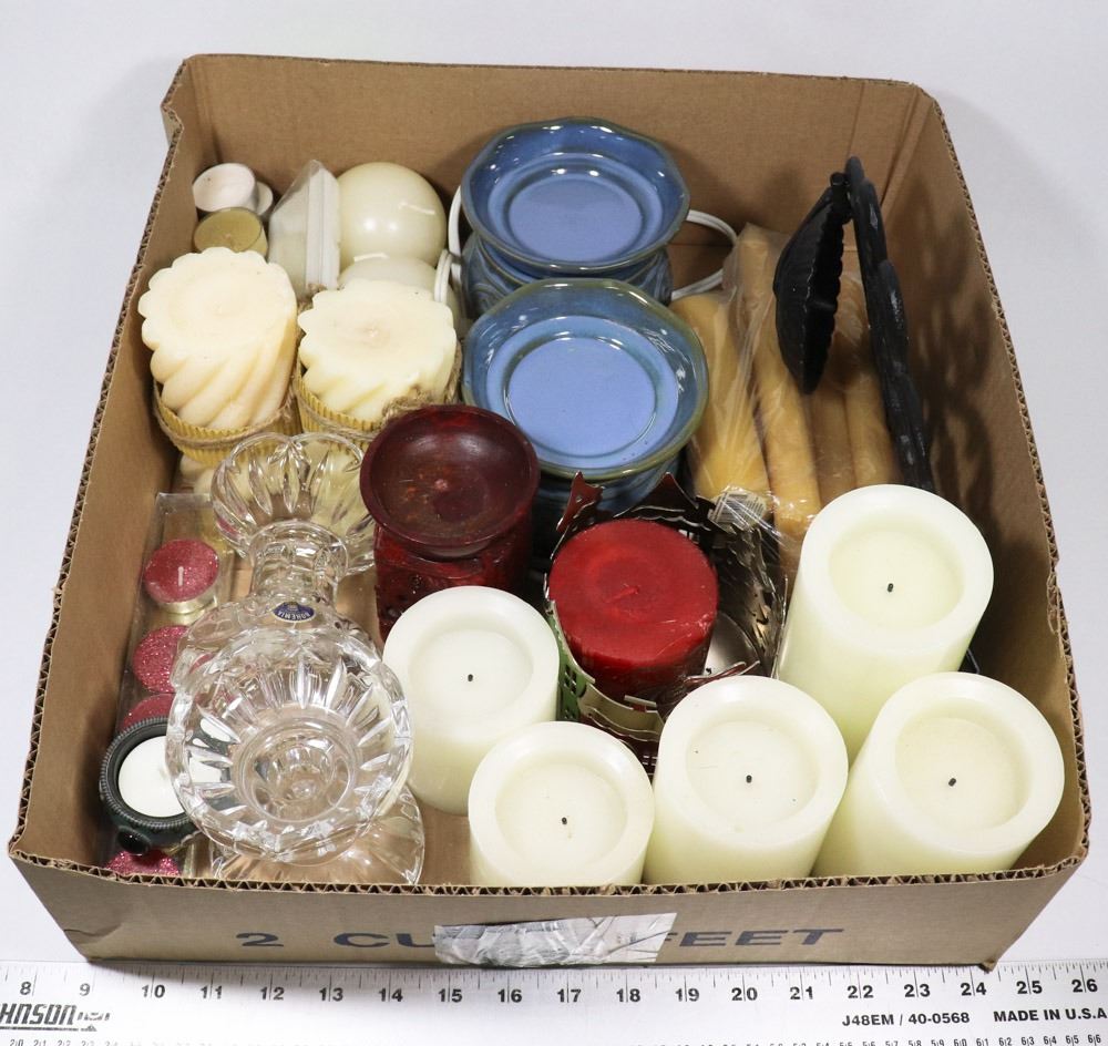 CANDLES, 3 WAX BURNERS, SCENTED WAX, 2 CRYSTAL CANDLE HOLDERS & LOTS OF CANDLES - GENERAL, HOUSEHOLD