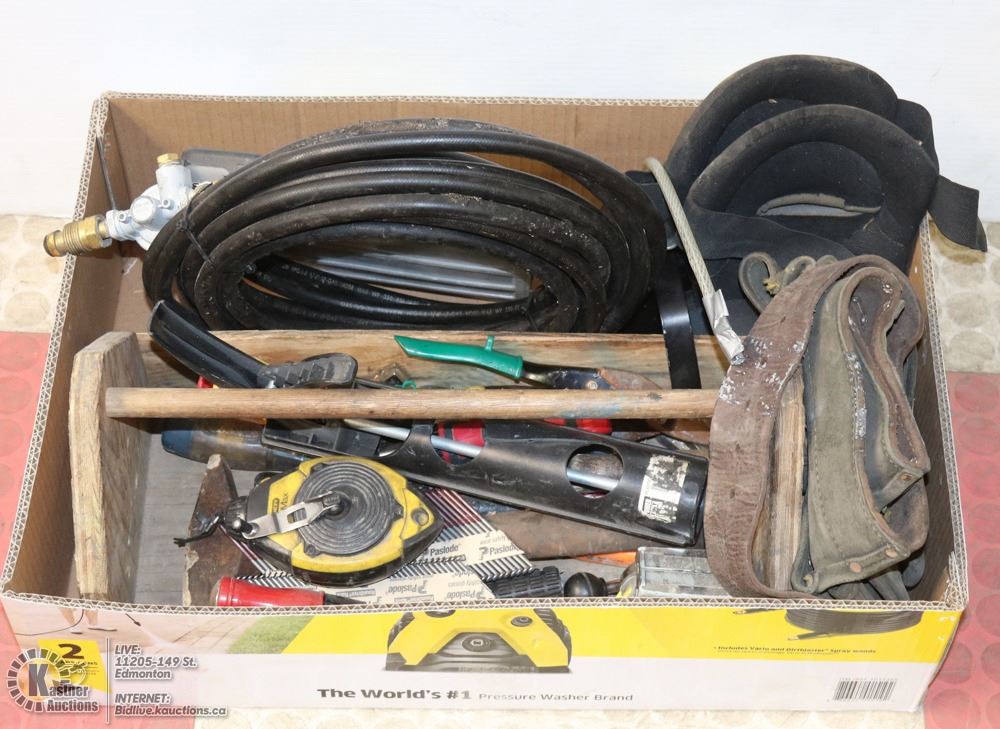 TOOLBELT, KNEEPADS, SORTER, LONG GAS LINE (PROPANE), HAMMERS, CHISELS, ETC.