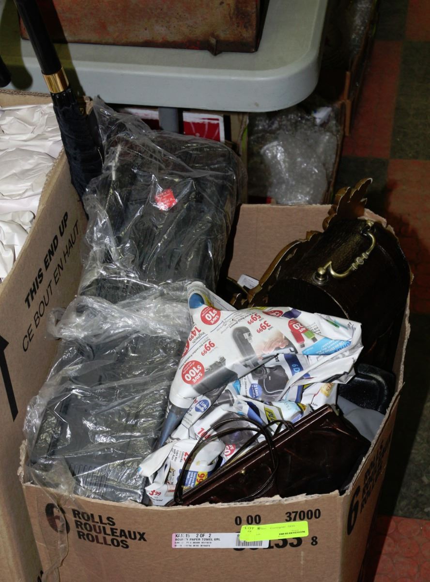 LARGE BOX WITH ESTATE PURSES, UMBRELLA ETC