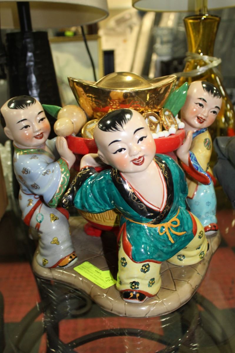 LARGE CERAMIC HAND PAINTED ASIAN "3 BOYS HOLDING