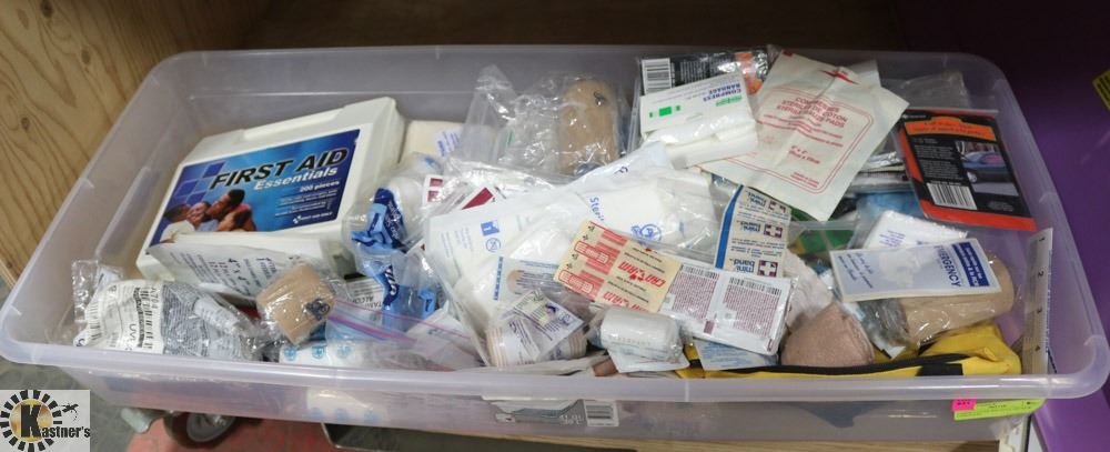 FIRST AID KIT ESSENTIALS & SUPPLIES INCL. 200-PC TRAVEL KIT, SAFETY GLASSES, EYE WASH KIT, WRAPS, BANDAGES, SPRAY DRESSING, HUNDREDS OF NEW ITEMS IN SEALED STORAGE BIN - GENERAL, HEALTH