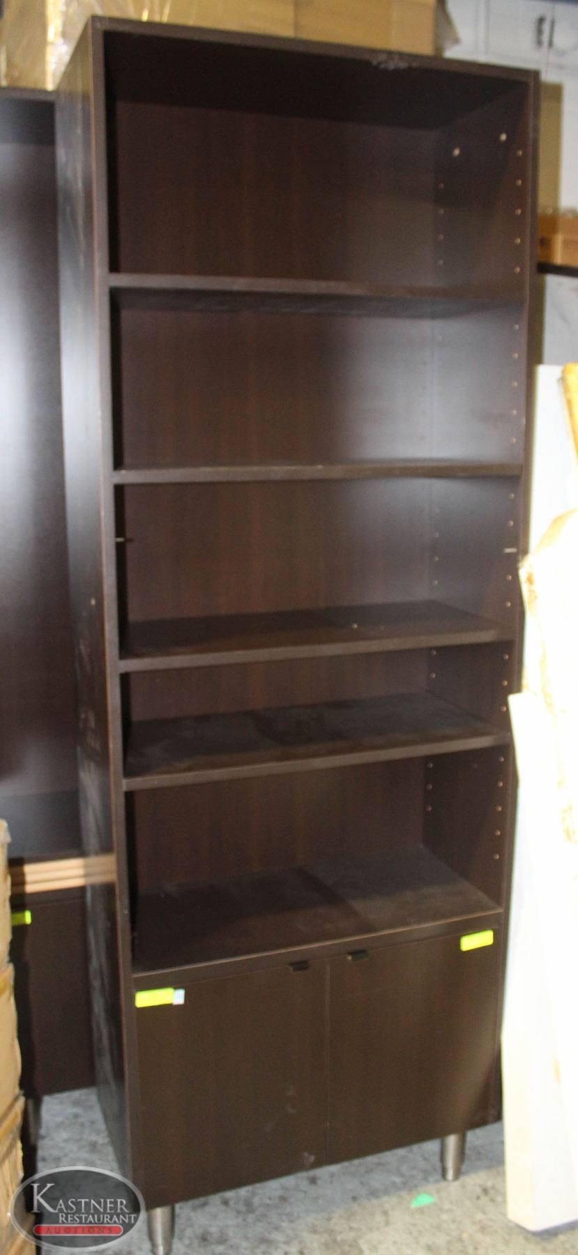 W/ 2 DOOR CABINET, 4 HEAVY DUTY & ADJUSTABLE LEGS. 31" X 15" X 88". DARK BROWN