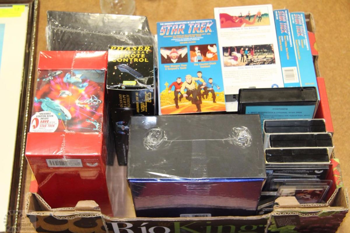 INCLUDING CUSTOMIZABLE CARD GAME LIMITED EDITION TIN WITH COA,PHASER UNIVERSAL REMOTE CONTROL, USS ENTERPRISE BELT BUCKLE, BETA TAPES,STAR TREK COMEDY VHS TAPE, NEW UNOPENED VHS STAR TREK II TRILOGY, 6 EPISODES GIFT SET, STAR TREK THE SEVENVOYAGES THE 7 MOVIES ALTOGETHER FOR THE FIRST TIME, ANIMATED ADVENTURES OF GENE RODEDENBERRY'S VHS SET 1-23, HOLOGRAM CARDS, FROM SKY MOTION (16 CARDS TOTAL)