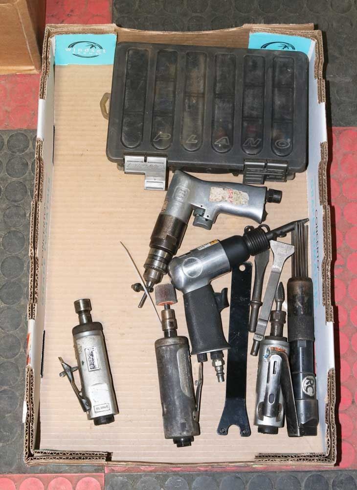 AIR DRILL, AIR HAMMER, SEVERAL HIGH SPEED GRINDERS, PLANO BOX WITH ACCESSORIES, ETC. - TOOLS