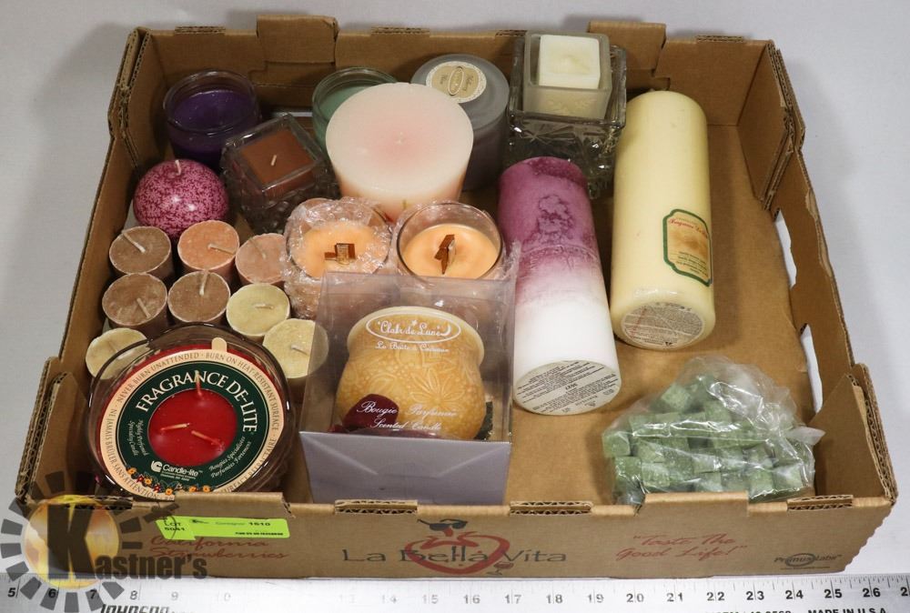 LARGE FLAT OF ASSORTED CANDLES AND CANDLE HOLDERS