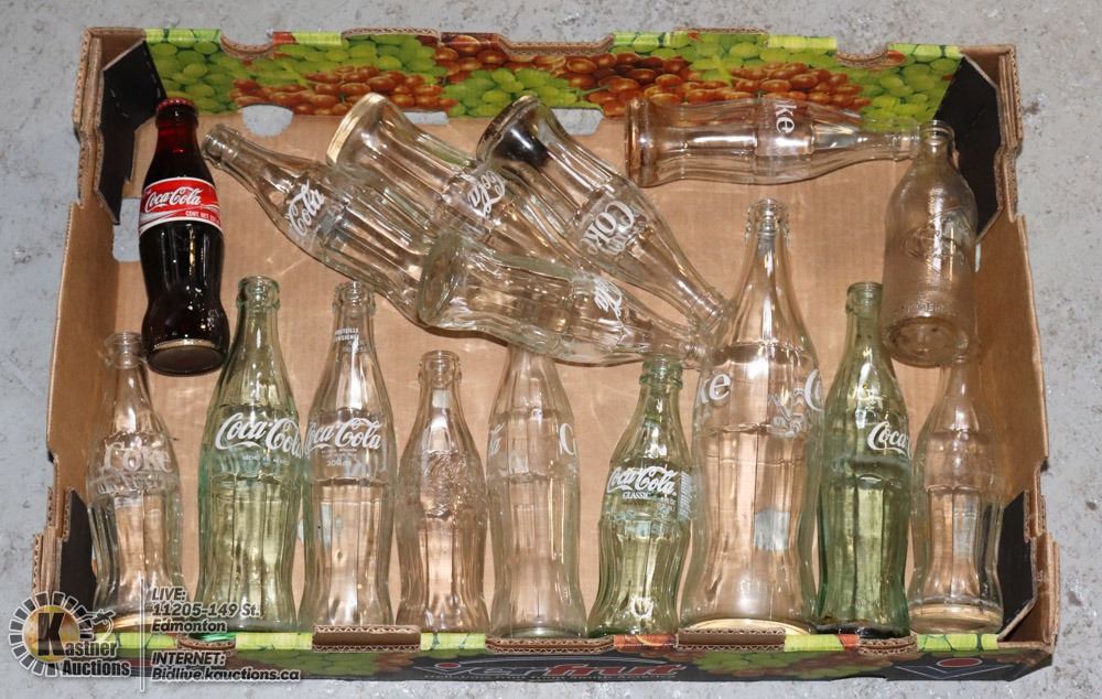 LARGE FLAT OF ASSORTED SIZE COKE BOTTLES