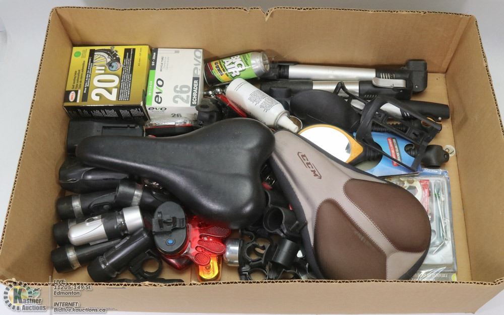 LARGE FLAT OF BIKE PARTS INCL TUBES, AIR PUMPS,