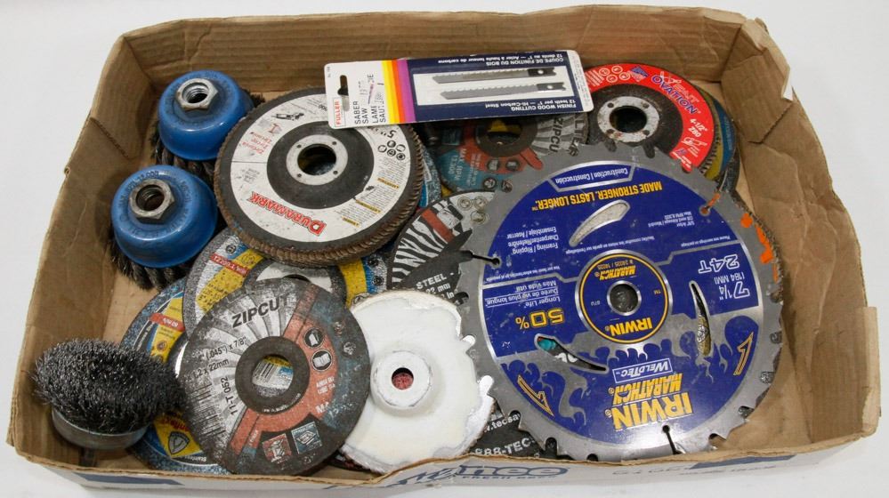 LARGE FLAT OF BLADES, GRINDING DISCS AND MORE