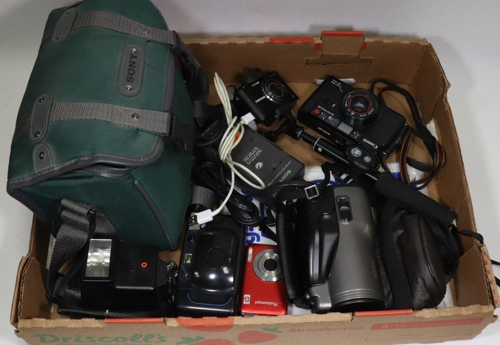 ZOOM, EPOCA 35 MM-105MM DIGITAL SONY HANDYCAM IN CASE, SAMSUNG & HP DIGITAL CAMS, CAMERA UNIVERSAL EXTENDABLE SELFIE STICK, VINTAGE CANON 35 MM SLR PENTAX FLASH, ETC. - ELECTRONICS