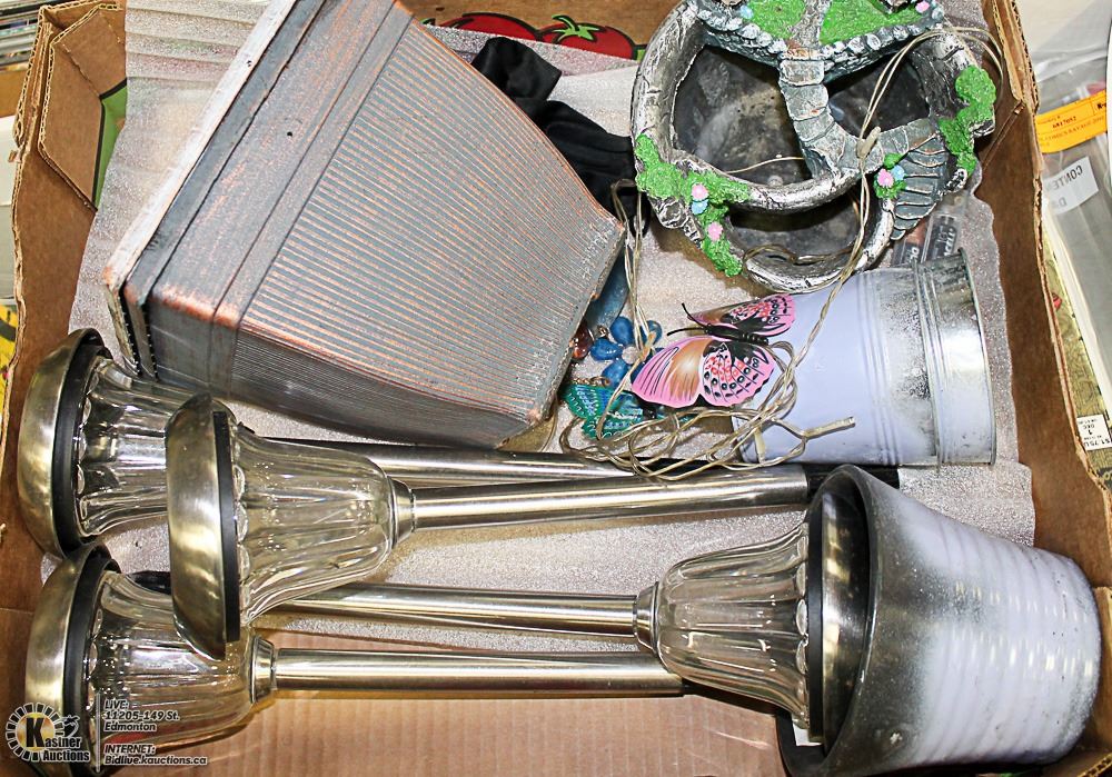 LARGE FLAT OF GARDEN DECOR, LIGHTS AND