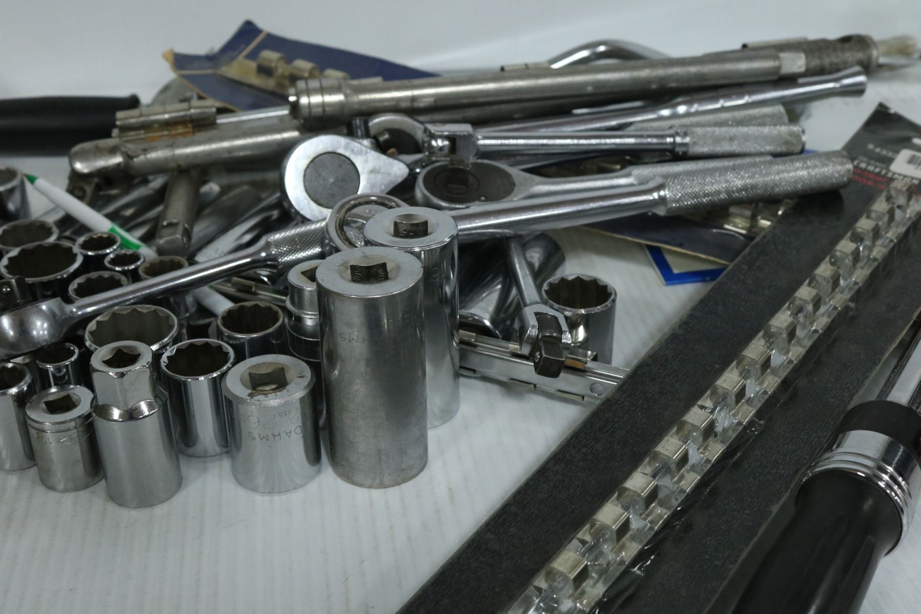 SOCKETS 2 X TORQUE WRENCHES 1/2 INCH DRIVE, 1/2 INCH DEEP SOCKET SET, PRECISION RIGHT-ANGLE RATCHET, SWING BAR, EXTENSIONS, 1/2 INCH AND 3/8 INCH DRIVE RATCHETS, NEW SOCKET RACKS, ETC.