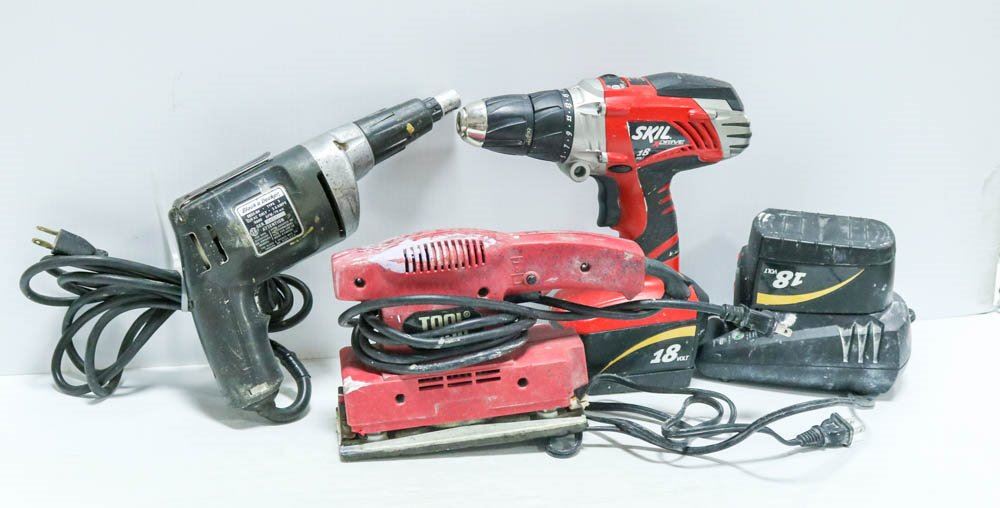 18 VOLT CORDLESS DRILL WITH 2 GOOD BATTERIES AND CHARGER, BLACK & DECKER DRYWALL SCREW GUN, TOOLSHOP PAD SANDER - TOOLS